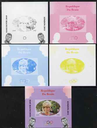 Benin 2009 Princess Diana, Kennedy & Olympics #09 individual deluxe sheet, the set of 5 imperf progressive proofs comprising the 4 individual colours plus all 4-colour composite, unmounted mint