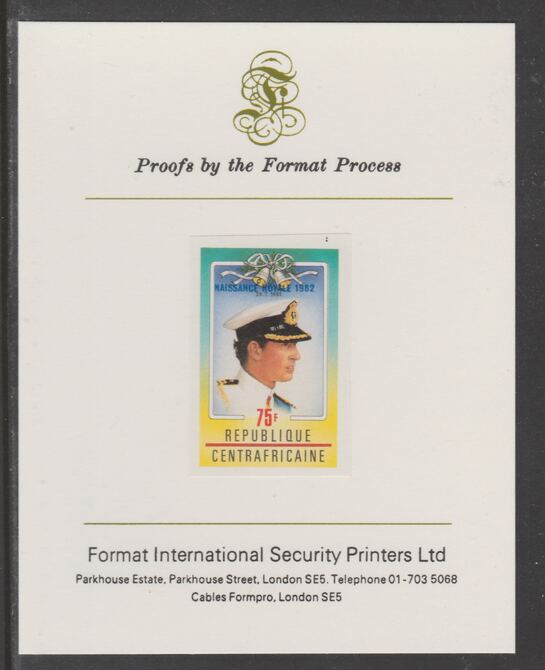 Central African Republic 1982 Birth of Prince William opt on Royal Wedding 75f imperf proof mounted on Format International proof card, as SG 864