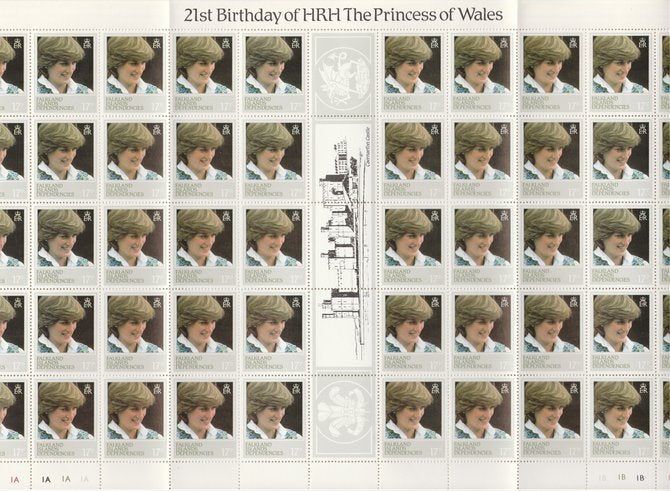 Falkland Islands Dependencies 1982 Princess Di's 21st Birthday 17p perf 13.5 variety complete folded sheet of 50, sympathetically folded between columns 3-4 and 7-8 to preserve the gutter, unmounted mint (SG 109a)