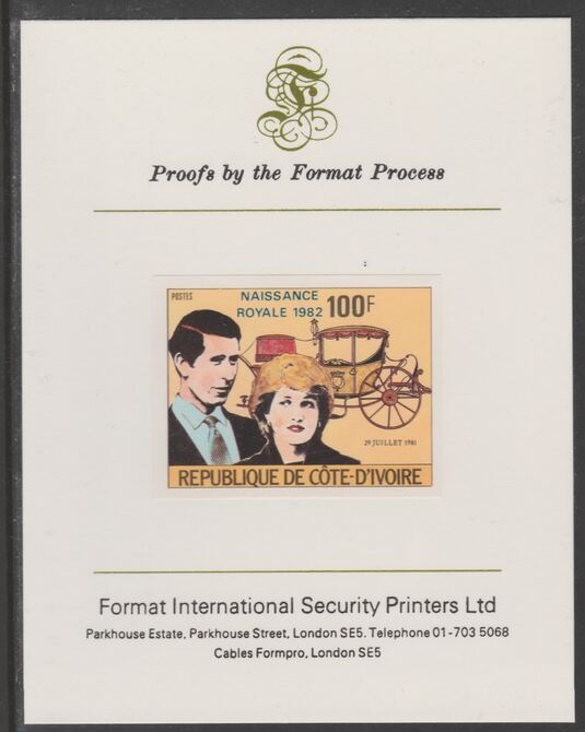 Ivory Coast 1982 Birth of Prince William opt on Royal Wedding 100f imperf proof mounted on Format International proof card, as SG 731