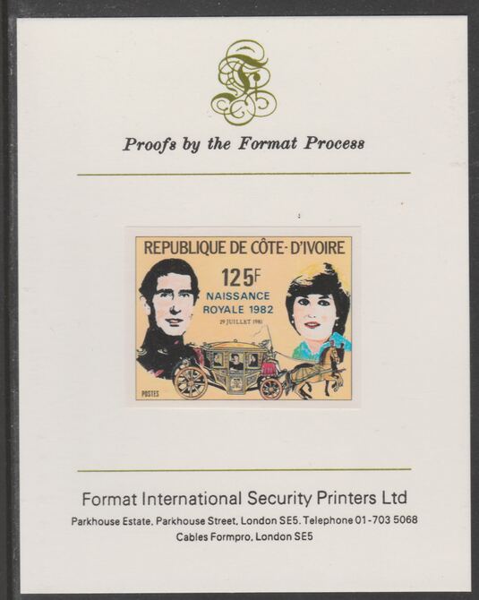 Ivory Coast 1982 Birth of Prince William opt on Royal Wedding 125f imperf proof mounted on Format International proof card, as SG 732