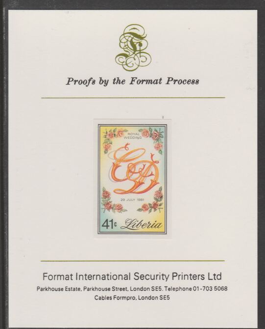 Liberia 1981 Royal Wedding 41c imperf proof mounted on Format International proof card, as SG 1491