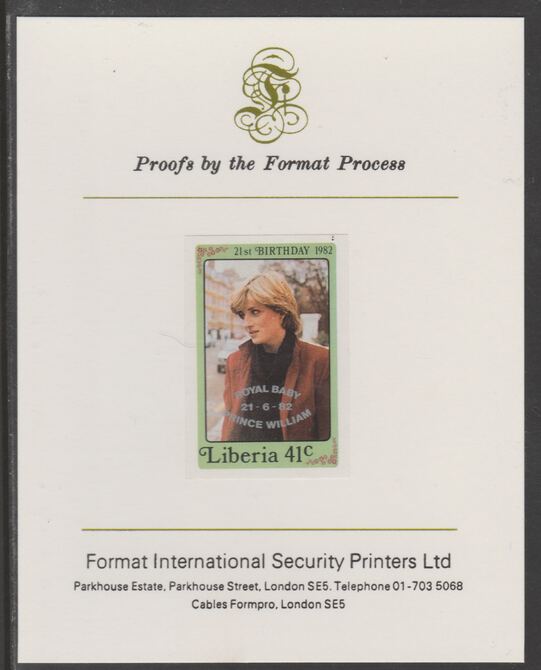 Liberia 1982 Birth of Prince William opt on Diana 21st Birthday 41c imperf proof mounted on Format International proof card, as SG 1545