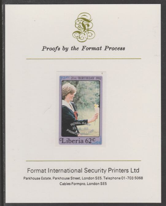Liberia 1982 Birth of Prince William opt on Diana 21st Birthday 62c imperf proof mounted on Format International proof card, as SG 1546