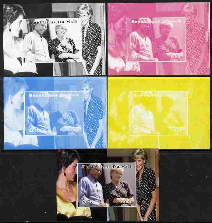 Mali 2010 Princess Diana #2 individual deluxe sheetlet (Stamp shows Diana with Nelson Mandela) - the set of 5 imperf progressive proofs comprising the 4 individual colours plus all 4-colour composite, unmounted mint