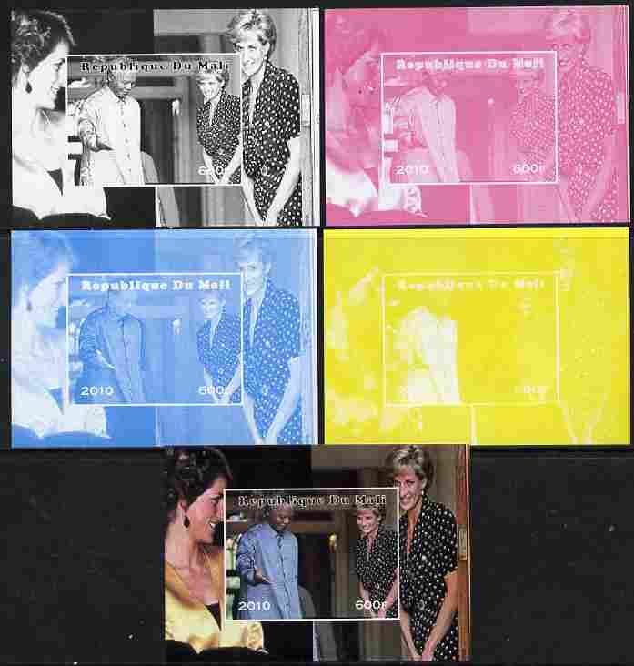 Mali 2010 Princess Diana #4 individual deluxe sheetlet (Stamp shows Diana with Nelson Mandela) - the set of 5 imperf progressive proofs comprising the 4 individual colours plus all 4-colour composite, unmounted mint