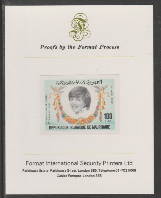 Mauritania 1982 Princess Diana's 21st Birthday 100um (ex m/sheet) imperf proof mounted on Format International proof card, as SG MS735