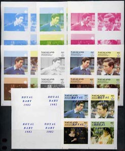 Nagaland 1982 Royal Baby opt on Royal Wedding imperf sheetlet containing set of 4 values, the set of 8 imperf progressive colour proofs comprising single colours and various colour combinations incl completed design (32 proofs) unmounted mint