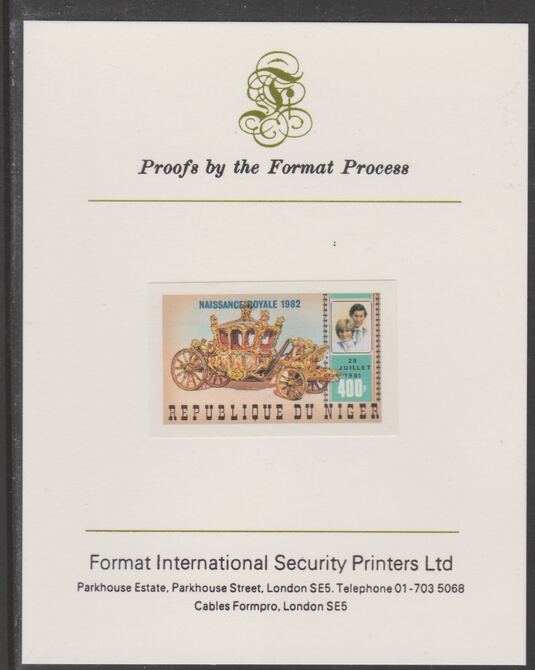 Niger Republic 1982 Birth of Prince William opt on Royal Wedding 400f (ex m/sheet) imperf proof mounted on Format International proof card, as SG MS908