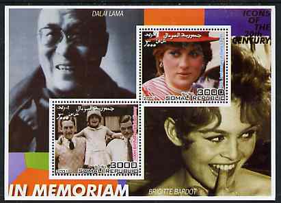 Somalia 2001 In Memoriam - Princess Diana & Walt Disney #05 perf sheetlet containing 2 values with Dalai Lama & Brigitte Bardot in background unmounted mint