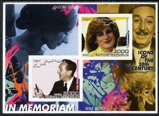 Somalia 2001 In Memoriam - Princess Diana & Walt Disney #15 imperf sheetlet containing 2 values with Isadora Duncan in background unmounted mint. Note this item is privately produced and is offered purely on its thematic appeal