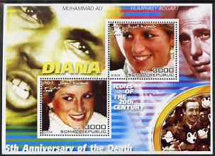 Somalia 2002 Princess Diana 5th Anniversary of Death #05 perf sheetlet containing 2 values with Muhammad Ali, Bogart & Walt Disney in background fine cto used