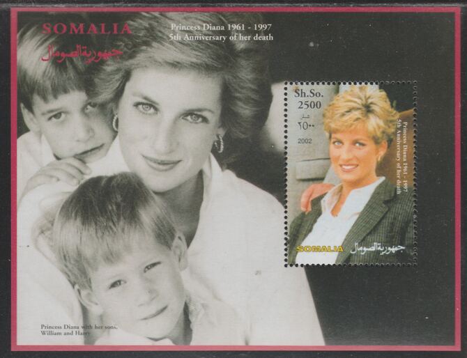 Somalia 2002 Princess Diana 5th Anniversary of Death perf souvenir sheet #6 unmounted mint.. Note this item is privately produced and is offered purely on its thematic appeal