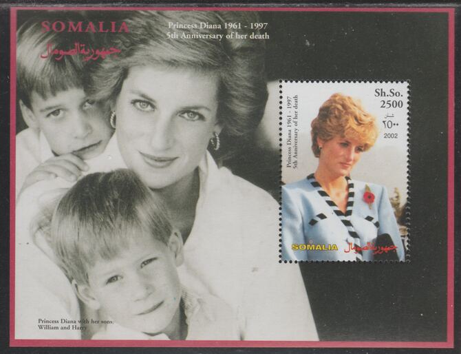 Somalia 2002 Princess Diana 5th Anniversary of Death perf souvenir sheet #7 unmounted mint.. Note this item is privately produced and is offered purely on its thematic appeal