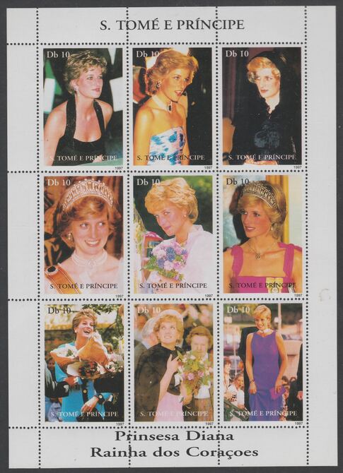 St Thomas & Prince Islands 1997 Princess Diana perf sheetlet containing 9 values unmounted mint. Note this item is privately produced and is offered purely on its thematic appeal
