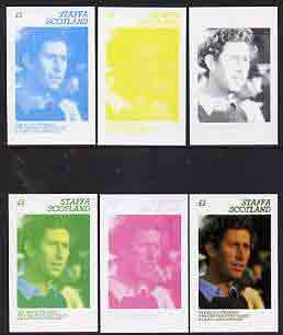 Staffa 1981 Royal Wedding imperf souvenir sheet (£1 value Charles) the set of 6 progressive proofs comprising the individueal colours, 2-colour combination plus completed design unmounted mint