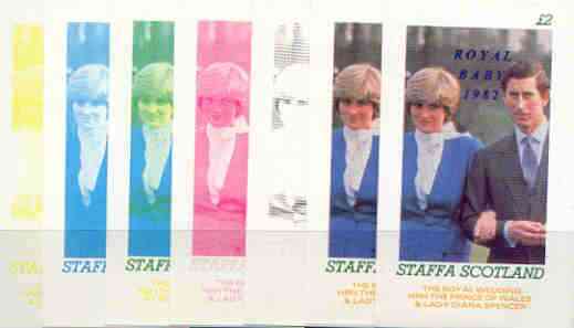 Staffa 1982 Royal Baby opt on Royal Wedding deluxe sheet (£2 value) the set of 7 imperf progressive colour proofs comprising the four individual colours plus various composites incl completed design unmounted mint