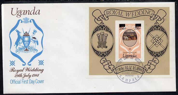Uganda 1981 Royal Wedding m/sheet (type A surcharge) on illustrated cover with first day cancel, SG MS 344