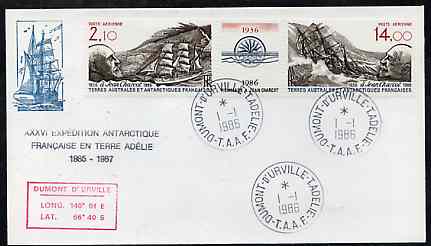 French Southern & Antarctic Territories 1986 Death Anniversary of Jean Charcot (explorer) strip of 2 plus label,on illustrated cover with first day cancel, SG 214a