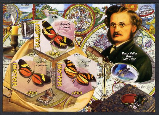 Malawi 2012 Butterflies & Entomologists - Henry Walter Bates imperf sheetlet containing 3 hexagonal shaped values unmounted mint