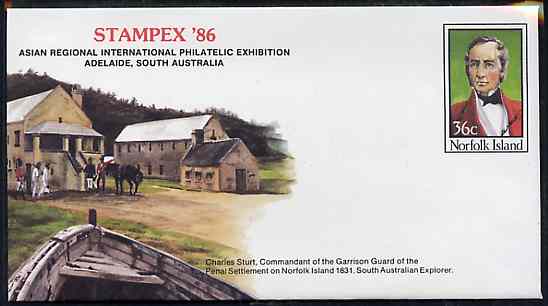 Norfolk Island 1986 'STAMPEX 86' 36c pre-stamped p/stat envelope commemorating Charles Stuart, Commander of the garrison