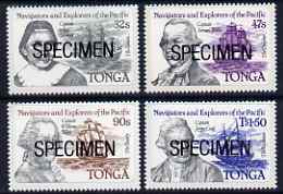 Tonga 1984 Navigators & Explorers of the Pacific (1st Issue) self-adhesive set of 4 opt'd SPECIMEN, as SG 861-64 (blocks or gutter pairs with anchor pro rata) unmounted mint