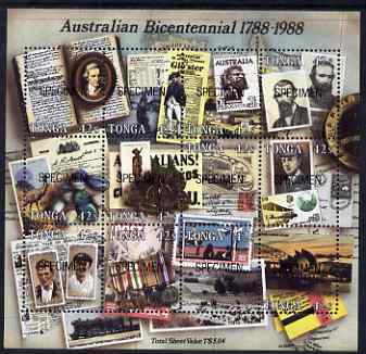 Tonga 1988 Australian Bicentenary composite perf proof sheet containing 12 values each overprinted SPECIMEN, as SG MS 989 unmounted mint