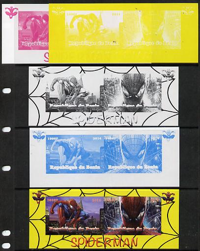 Benin 2014 Spiderman (Comic Strip) sheetlet containing 2 values - the set of 5 imperf progressive proofs comprising the 4 individual colours plus all 4-colour composite, unmounted mint