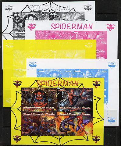 Benin 2014 Spiderman (Comic Strip) sheetlet containing 4 values - the set of 5 imperf progressive proofs comprising the 4 individual colours plus all 4-colour composite, unmounted mint