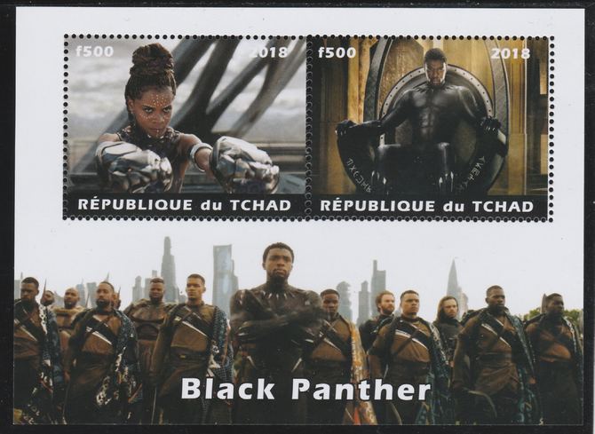 Chad 2018 Black Panther perf sheetlet containing 2 values unmounted mint. Note this item is privately produced and is offered purely on its thematic appeal. .