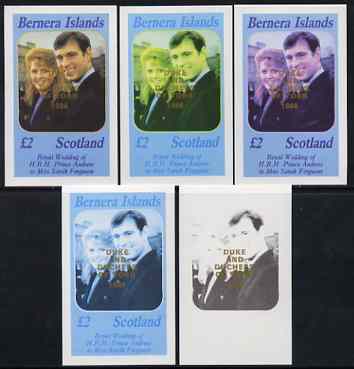 Bernera 1986 Royal Wedding imperf deluxe sheet (£2 value) opt'd Duke & Duchess of York in gold, the set of 5 progressive proofs, comprising single colour, 2-colour, two x 3-colour combinations plus completed design each with opt. ……Details Below