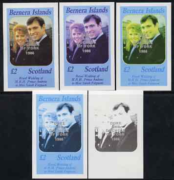 Bernera 1986 Royal Wedding imperf deluxe sheet (£2 value) opt'd Duke & Duchess of York in silver, the set of 5 progressive proofs, comprising single colour, 2-colour, two x 3-colour combinations plus completed design each with opt. (5 proofs) unmounted mint