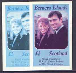 Bernera 1986 Royal Wedding imperf deluxe sheet (£2 value) two progressive proofs, comprising 2-colour and 3-colour combinations (the remaining progressives were damaged by water at the printers) unmounted mint