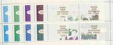 Calve Island 1986 Royal Wedding perf sheetlet of 4 opt'd Duke & Duchess of York in gold, the set of 5 progressive proofs, comprising single colour, 2-colour, two x 3-colour combinations plus completed design each with opt. (20 proofs) unmounted mint