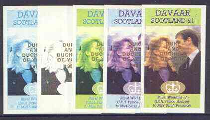 Davaar Island 1986 Royal Wedding imperf souvenir sheet (£1 value) opt'd Duke & Duchess of York in gold, the set of 5 progressive proofs, comprising single colour, 2-colour, two x 3-colour combinations plus completed design each wi……Details Below