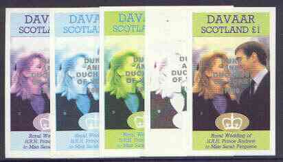 Davaar Island 1986 Royal Wedding imperf souvenir sheet (£1 value) opt'd Duke & Duchess of York in silver, the set of 5 progressive proofs, comprising single colour, 2-colour, two x 3-colour combinations plus completed design each ……Details Below