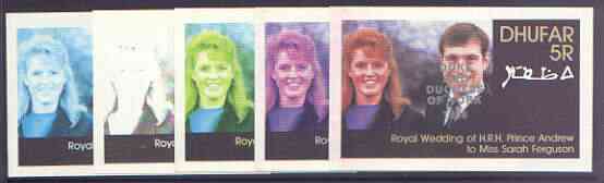 Dhufar 1986 Royal Wedding imperf deluxe sheet (5r) opt'd Duke & Duchess of York in silver, the set of 5 progressive proofs, comprising single colour, 2-colour, two x 3-colour combinations plus completed design, all with opt. (5 proofs) unmounted mint
