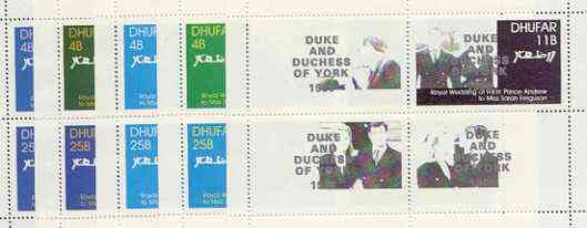 Dhufar 1986 Royal Wedding perf set of 4 values opt'd Duke & Duchess of York in silver, the set of 5 progressive proofs, comprising single colour, 2-colour, two x 3-colour combinations plus completed design, all with opt. (20 proofs) unmounted mint