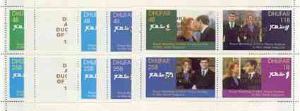 Dhufar 1986 Royal Wedding perf sheetlet of 4 opt'd Duke & Duchess of York in gold, the set of 5 progressive proofs, comprising single colour, 2-colour, two x 3-colour combinations plus completed design, all with opt. (20 proofs) unmounted mint