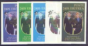 Eritrea 1986 Royal Wedding imperf deluxe sheet (240s) opt'd Duke & Duchess of York in gold, the set of 5 progressive proofs, comprising single colour, 2-colour, two x 3-colour combinations plus completed design, all with opt. (5 proofs)