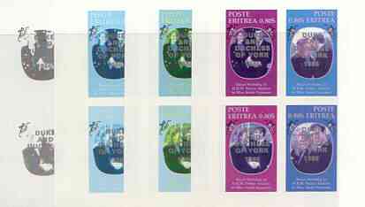 Eritrea 1986 Royal Wedding imperf sheetlet of 4 opt'd Duke & Duchess of York in silver, the set of 4 progressive proofs, comprising single colour, 2-colour & two x 3-colour combinations, all with opt. (16 proofs)