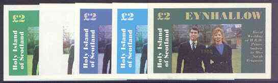 Eynhallow 1986 Royal Wedding imperf deluxe sheet (£2 value) opt'd Duke & Duchess of York in gold, the set of 5 progressive proofs, comprising single colour, 2-colour, two x 3-colour combinations plus completed design each with opt……Details Below