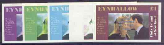Eynhallow 1986 Royal Wedding imperf souvenir sheet (£1 value) opt'd Duke & Duchess of York in silver, the set of 5 progressive proofs, comprising single colour, 2-colour, two x 3-colour combinations plus completed design each with opt. (5 proofs) unmounted mint
