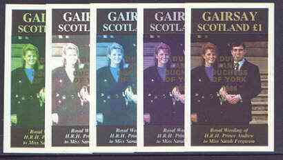 Gairsay 1986 Royal Wedding imperf souvenir sheet (£1 value) opt'd Duke & Duchess of York in gold, the set of 5 progressive proofs, comprising single colour, 2-colour, two x 3-colour combinations plus completed design each with opt. (5 proofs) unmounted mint