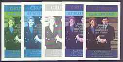 Grunay 1986 Royal Wedding imperf deluxe sheet (£2 value) opt'd Duke & Duchess of York in silver, the set of 5 progressive proofs, comprising single colour, 2-colour, two x 3-colour combinations plus completed design, each with opt……Details Below