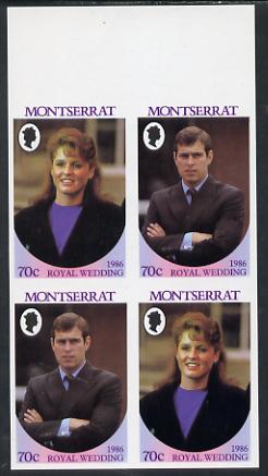 Montserrat 1986 Royal Wedding 70c in unmounted mint imperf proof block of 4 (2 se-tenant pairs) without staple holes in margin and therefore not from booklets