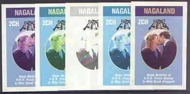 Nagaland 1986 Royal Wedding imperf deluxe sheet (2ch value) the set of 5 progressive proofs, comprising single colour, 2-colour, two x 3-colour combinations plus completed design (5 proofs) unmounted mint