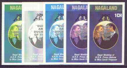 Nagaland 1986 Royal Wedding imperf souvenir sheet (1ch value) opt'd Duke & Duchess of York in silver, the set of 5 progressive proofs, comprising single colour, 2-colour, two x 3-colour combinations plus completed design each with……Details Below