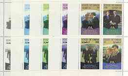 Oman 1986 Royal Wedding perf sheetlet of 4 opt'd Duke & Duchess of York in gold, the set of 5 progressive proofs, comprising single colour, 2-colour, two x 3-colour combinations plus completed design, all with opt. (20 proofs) unmounted mint