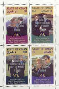 Oman 1986 Royal Wedding perf sheetlet of 4 opt'd Duke & Duchess of York in silver, unmounted mint